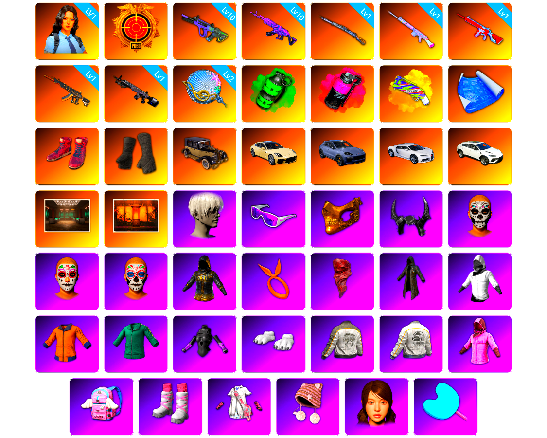 | 成长武器 | 猛虎98K 霓虹AUG 玩偶大炮 无信号M416 美杜莎M762 塞壬平底锅 妖魔之触ACE 暗影之主Mk12 |